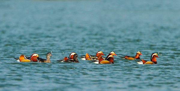 大寒時節,浙江省寧波市江北區蓀湖吸引野生鳥類來此過冬,幾只色彩艷麗的鴛鴦游弋在湖面。(浙江省寧波市江北區紀委監委供 沈國峰 攝)
