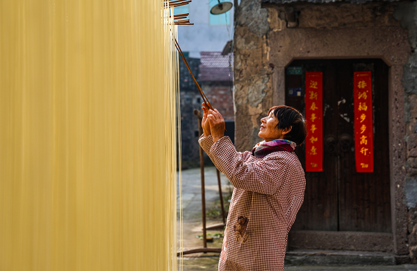 在浙江省永康市,村民們搶抓晴好天氣將抽好的土索面拿出來晾曬,咸香味四溢。(浙江省永康市紀委監委供 胡華超 攝)
